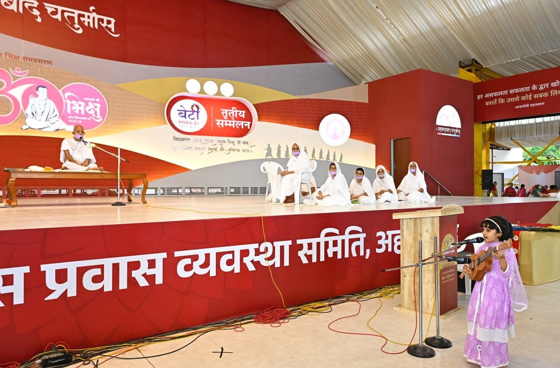 बालिका धृति दूगड़ ने अपनी बालसुलभ प्रस्तुति दी। ‘बेटी तेरापंथ की’ में संभागी बने दोहिता बालक प्रेक्षित जैन ने अपनी गीत को प्रस्तुति दी। मोटेरा-ज्ञानशाला के ज्ञानार्थियों ने भी अपनी प्रस्तुति दी। जैन श्वेताम्बर तेरापंथी महासभा के ज्ञानशाला प्रकोष्ठ के अंतर्गत ‘शिशु संस्कार बोध भाग-4 का नवीन संस्करण आचार्यश्री की मंगल सन्निधि में लोकार्पित किया गया। ‘बेटी तेरापंथ की’ सम्मेलन में संभागी बनी इन्दौर की बेटियों ने भी पूज्य सन्निधि में अपनी प्रस्तुति देते हुए अपने संकल्पों की राखी गुरुचरणों में समर्पित की। यह संकल्प देश भर से लगभग 700 बेटियों ने इन संकल्पों को स्वीकार कर रखी हैं। आचार्यश्री के मंगलपाठ के साथ आज का कार्यक्रम सुसम्पन्न हुआ।