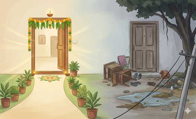 मुख्य द्वार के सामने जूते-चप्पल या कूड़ेदान रखना वास्तु दोष उत्पन्न करता है। यह घर में प्रवेश करने वाली सकारात्मक ऊर्जा को रोकता है और मानसिक अशांति तथा नकारात्मक वातावरण पैदा कर सकता है।