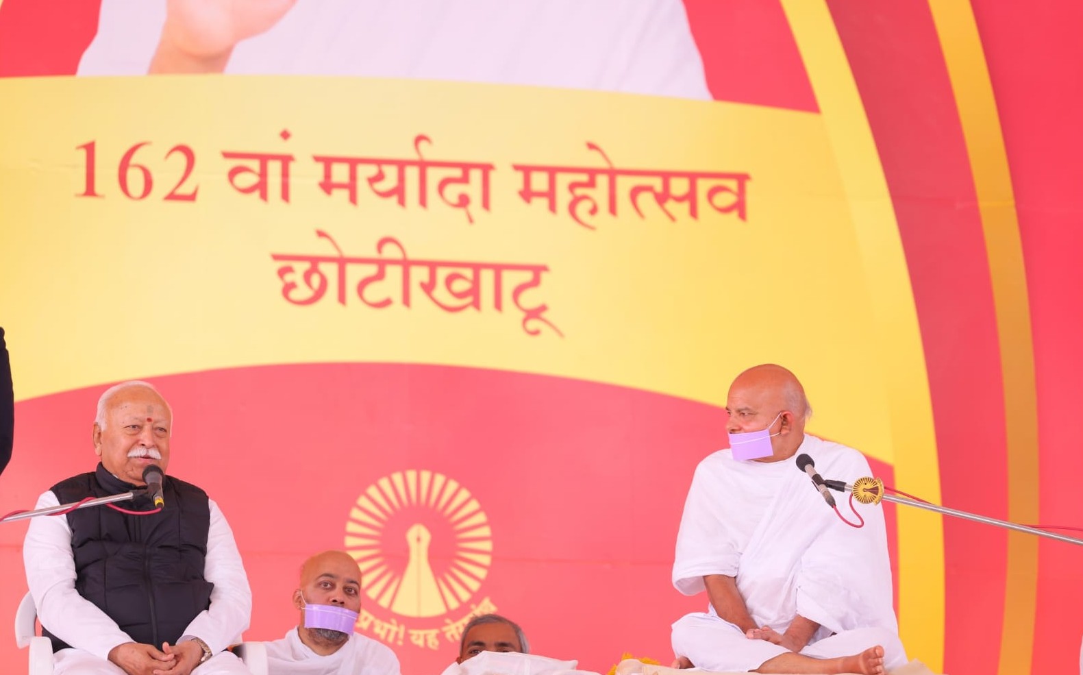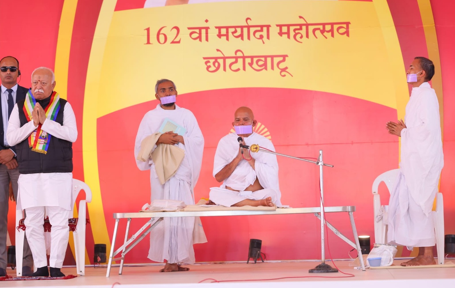 आचार्यश्री के मंगल प्रवचन के उपरान्त राष्ट्रीय स्वयं सेवक संघ के सरसंघचालक श्री मोहन भावगत ने अपने अभिभाषण में कहा कि परम श्रद्धेय आचार्यप्रवर! हम लोग जो लाठी चलाते हैं, वह क्यों चलाते हैं, इस बात स्मरण रखने के लिए ही आप जैसे संतों के पास आता हूं। मनसुखजी हमारे संघ में संघचालक है और आज यहां एक्स्ट्रा आना हुआ है, वह मेरा एक्स्ट्रा लाभ है। जैसा आचार्यश्रीजी ने बताया वहीं भारत का कार्य है दुनिया को मर्यादा सीखाना। पुस्तक में बात लिखी हुई है, लेकिन उससे बात पूरी नहीं होती। उसको अपने आचरण से बताने का कार्य भारत करता है। धर्म के पीछे तो सत्य है, उसे हमारे पुर्वज जानते हैं, बाहर के देशों में लोग यह नहीं जानते। इसलिए दुनिया को इस सत्य का पता नहीं होता। कानून एक स्थान तक होता है, आगे का निर्णय धर्म ही करता है। श्री भागवत ने महाराजा शिवि की कथा का वर्णन करते हुए कहा कि भारत दुनिया का एकमात्र ऐसा देश है जो सभी देशों की मदद को आगे बढ़ता है, बिना किसी स्वार्थ के। भारत धर्म को जानता है। व्यवहार का संतुलन व अनुशासन भारत जानता है। जीवन को अच्छा बनाने के लिए त्यागी संतों की सन्निधि में उपस्थित होना होता है। मेरे यहां बार-बार आने का एकमात्र कारण है कि आचार्यश्रीजी की सन्निधि में पहुंचकर आंखें खुल जाती हैं। मैं पुनः आचार्यश्रीजी को वंदन करता हूं।