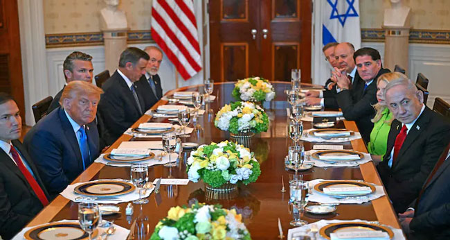 व्हाइट हाउस में आयोजित रात्रिभोज के दौरान नेतन्याहू ने कहा, “वे इस वक्त भी एक के बाद एक देश और क्षेत्र में शांति स्थापित कर रहे हैं।”