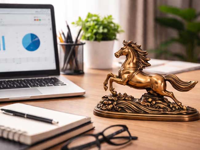 इन उपायों में एक अत्यंत लोकप्रिय और प्रभावी सुझाव है—ऑफिस डेस्क पर लैपटॉप के पास दौड़ते हुए घोड़े की मूर्ति स्थापित करना।